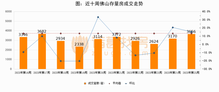 存量房方面,第25周佛山存量房成交3656套,较上周增加486套,环比上涨15.3%。从近十周成交走势来看,周均成交套数为3116套,本周高于平均水平17.3%。
