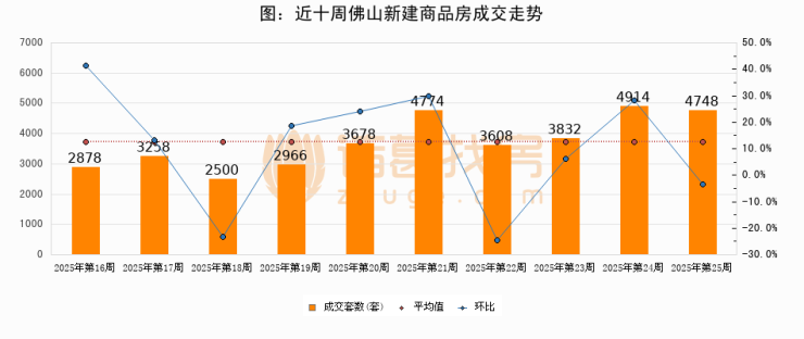 进入2025年第25周(06月16日-06月22日),佛山新建商品房成交4748套,较上周减少166套,环比下降3.4%