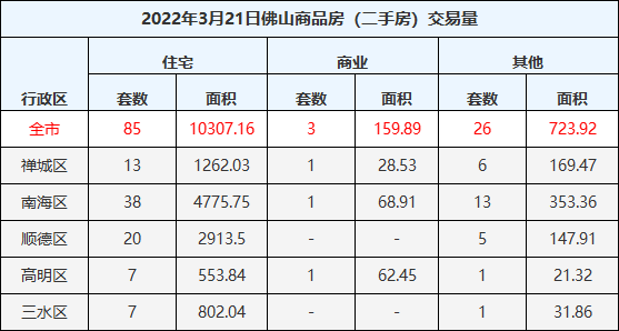 二手住宅成交85套,成交面积10307.16㎡,禅城13套,南海区38套,顺德区20套,高明区7套,三水区7套。