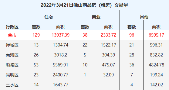 3月21日,佛山一手住宅成交129套,成交面积13937.39㎡