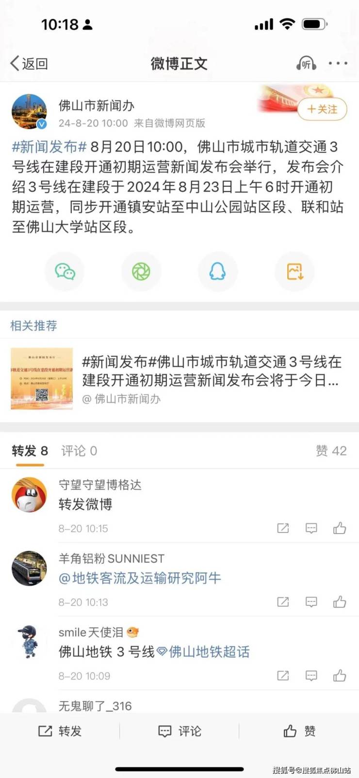 刚刚,佛山市新闻办发布,称8月20日10:00,佛山市城市轨道交通3号线在建段开通初期运营新闻发布会举行。