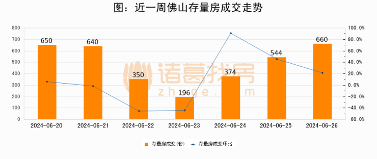 从存量房来看,2024年06月26日佛山存量房单日成交660套,比昨日增加116套,环比上涨21.3%。从近一周存量房成交来看,佛山存量房日均成交套数为487套,06月26日单日成交660套,高于近一周平均水平35.5%。