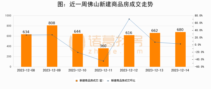 根据佛山市住房保障和房产信息网数据显示,2023年12月14日佛山新建商品房成交680套,较昨日增加18套,环比上涨2.7%