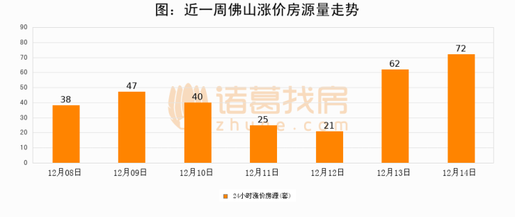 根据诸葛找房数据显示,佛山24小时涨价房源量为72套,较12月13日增加10套,环比上涨16.1%。与此同时,涨价房源占比小幅扩大,业主信心有所提升。