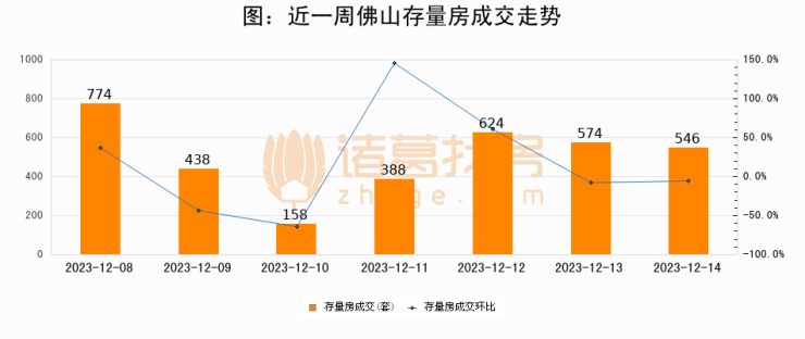 从存量房来看,2023年12月14日佛山存量房单日成交546套,比昨日减少28套,环比下降4.9%。从近一周存量房成交来看,佛山存量房日均成交套数为500套,12月14日单日成交546套,高于近一周平均水平9.2%。