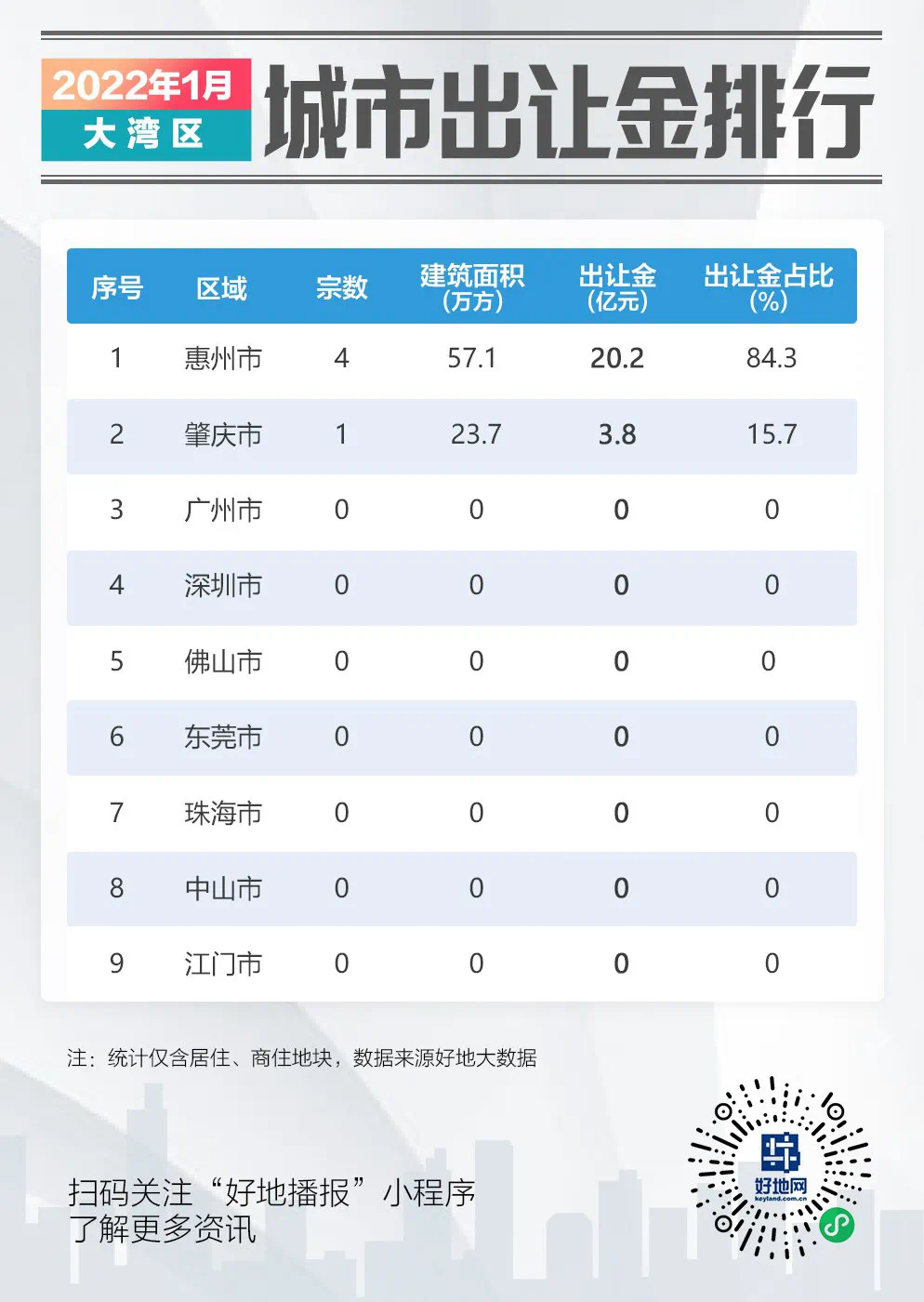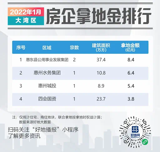 2022年排名前列个月,也是春节前最后一个月,大湾区9市出让金情况如何,谁较高,哪些房企在拿地?好地研究院统计如下:一、出让金同比降9成据好地大数据,1月大湾区仅惠州、肇庆两市有涉宅地成交。惠州市成交4宗地,成交总建面57.1万方,总出让金20.2亿元,占大湾区出让金的84.3%。而肇庆市成交1宗地,成交建面23.7万方,出让金额3.8亿元,占比15.7%。
