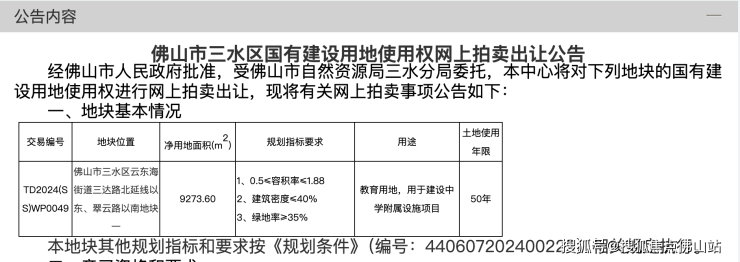 日前,一宗位于佛山市三水区云东海街道三达路北延线以东、翠云路以南的地块(即佛山市季华中学南侧)挂牌出让。