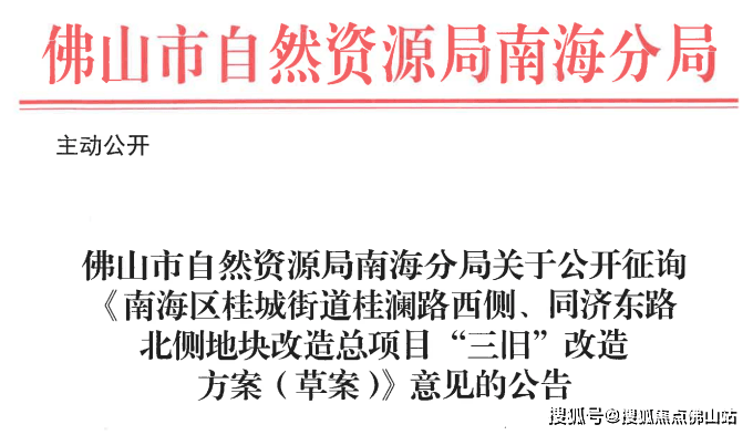 11月26日,佛山市自然资源局南海分局发布关于公开征询《南海区桂城街道桂澜路西侧、同济东路北侧地块改造总项目“三旧”改造方案(草案)》意见的公告。