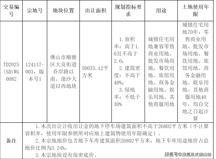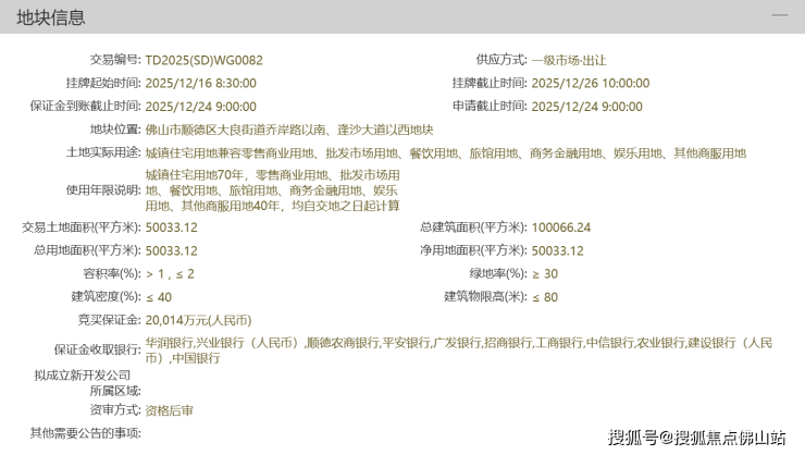 11月26日,佛山市顺德区大良街道乔岸路以南、逢沙大道以西地块挂牌,地块起拍价100067万,单价约1万/㎡,拟将于12月26日进行网拍。宗地总占地面积50033.12㎡,容积率不高于2,绿地率不低于30%,…