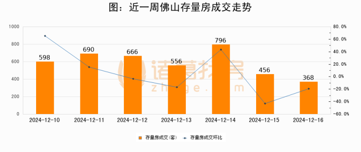 从存量房来看,2024年12月16日佛山存量房单日成交368套,比昨日减少88套,环比下降19.3%。从近一周存量房成交来看,佛山存量房日均成交套数为590套,12月16日单日成交368套,低于近一周平均水平37.6%。