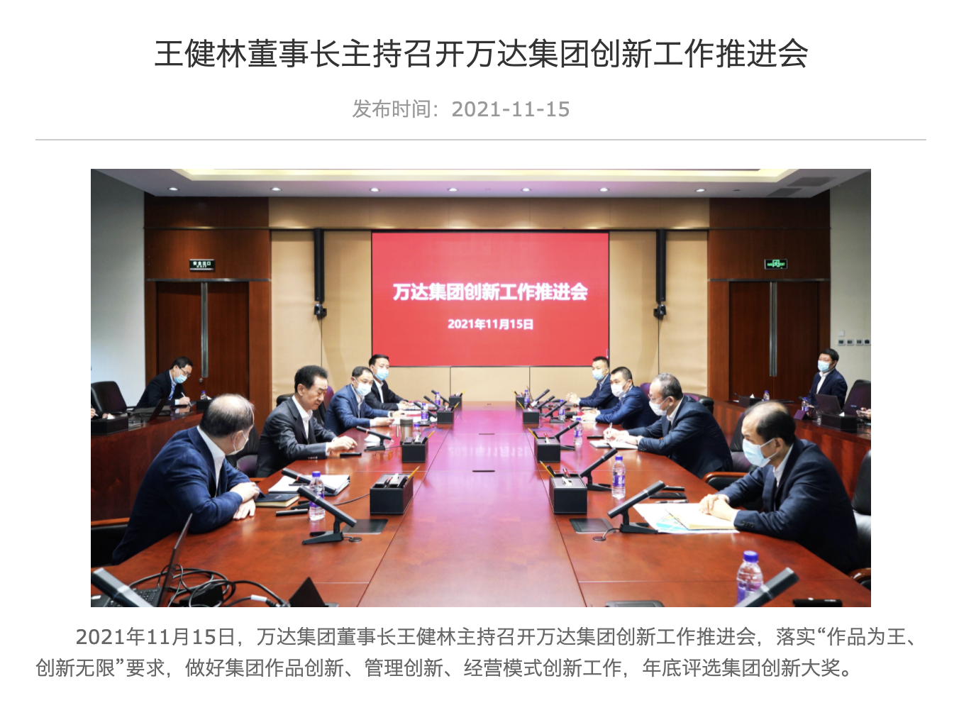 11月15日上午,万达集团官网发布消息称,王健林在今天主持召开万达集团创新工作推进会,落实“作品为王、创新无限”要求,做好集团作品创新、管理创新、经营模式创新工作,年底评选集团创新大奖。