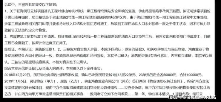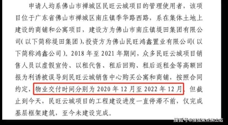 佛山电视台曾报道,2019年7月,一位业主购买了一套民旺云城的公寓,原本于2021年6月30号前交楼。