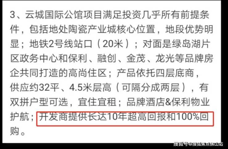 当年的宣传资料显示,只要“买”了商铺/公寓,即可签订10年返租协议,月月稳收租,可分8%的酒店运营利益,复式返租保底1500月/套。此外,开发商还承诺10年内原价回购。