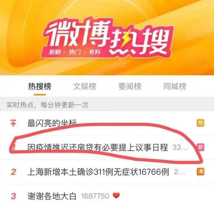 前段时间,一则话题为#因疫情推迟还房贷有必要提上议事日程#冲上微博热搜排名前列。