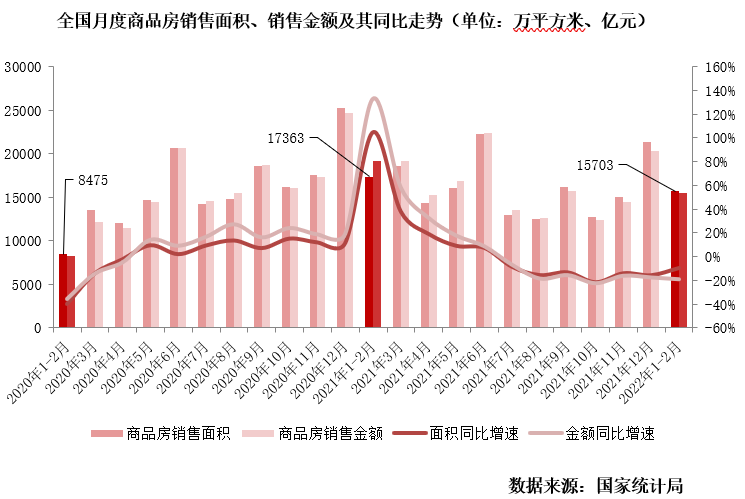 根据国家统计局公布数据显示,1—2月,商品房销售面积15703万平方米,同比下降9.6%;商品房销售额15459亿元,下降19.3%。