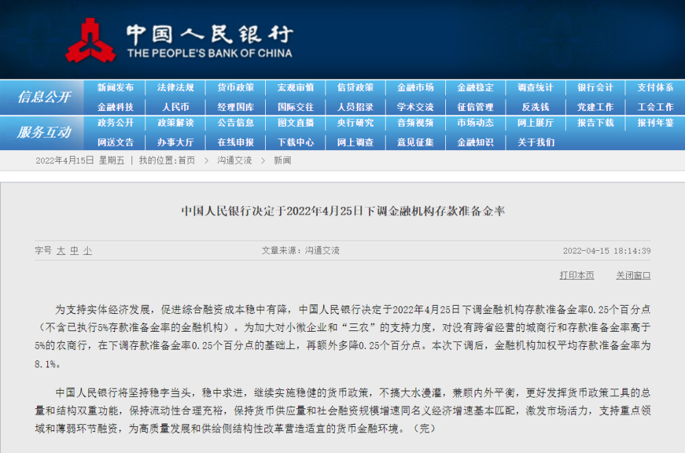 据央行4月15日发布的公告表示:为支持实体经济发展,促进综合融资成本稳中有降,中国人民银行决定于2022年4月25日下调金融机构存款准备金率0.25个百分点(不含已执行5%存款准备金率的金融机构)。