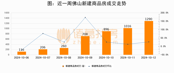根据佛山市住房保障和房产信息网数据显示,2024年10月12日佛山新建商品房成交1290套,较昨日增加274套,环比上涨27%