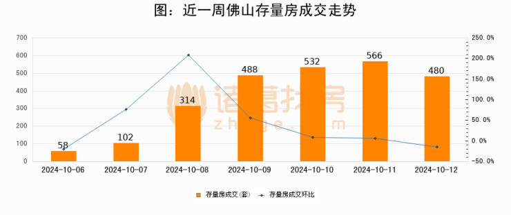 从存量房来看,2024年10月12日佛山存量房单日成交480套,比昨日减少86套,环比下降15.2%。从近一周存量房成交来看,佛山存量房日均成交套数为362套,10月12日单日成交480套,高于近一周平均水平32.6%。