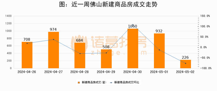 根据佛山市住房保障和房产信息网数据显示,2024年05月02日佛山新建商品房成交226套,较昨日减少706套,环比下降75.8%。近一周佛山新建商品房日均成交728套。05月02日单日成交226套,低于近一周平均水平69%。