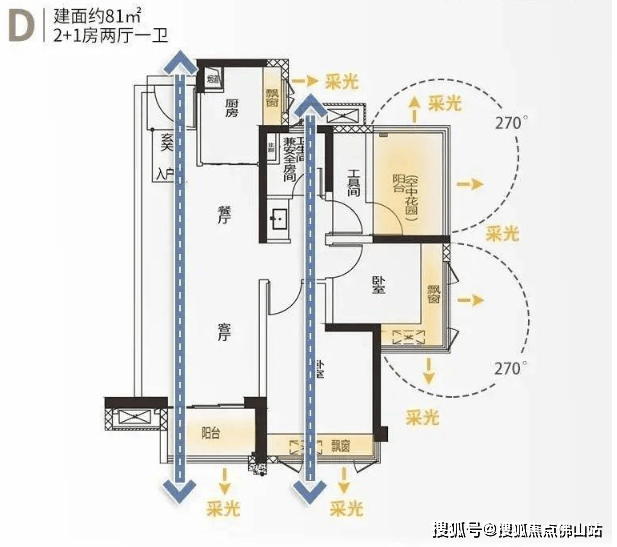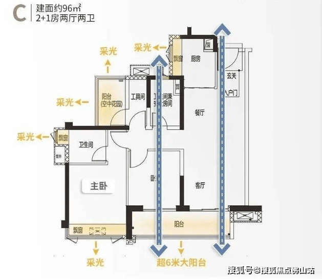 三房两厅两卫设计,空间尺寸相对81㎡得到了加强,满足更多生活需求。超6米南向大阳台,连通次卧,为老人提供舒适生活空间;全屋飘窗设计,空间使用率和性价比极高。