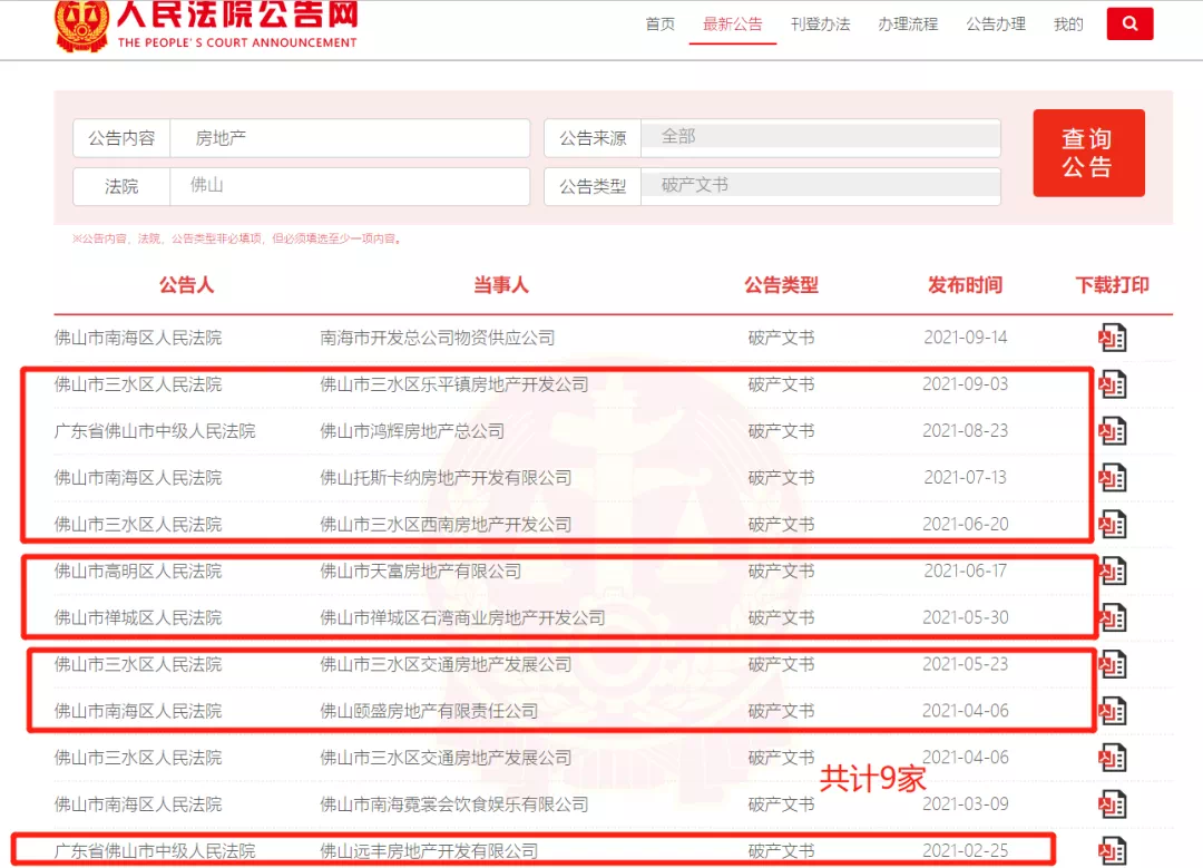 据小编查询人民法院公告官网不完全统计,2021年,佛山共有9家房地产企业相继宣告破产。