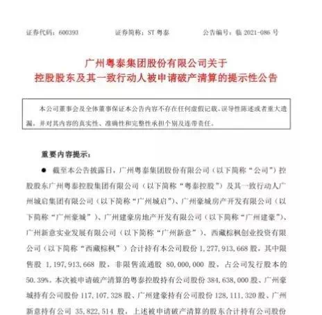 就在上个月,拥有20多年历史的粤系老牌房企,曾与恒大、富力地产并称为广州民营房企“三剑客”的粤泰集团,最终还是走向了申请破产清算的道路!