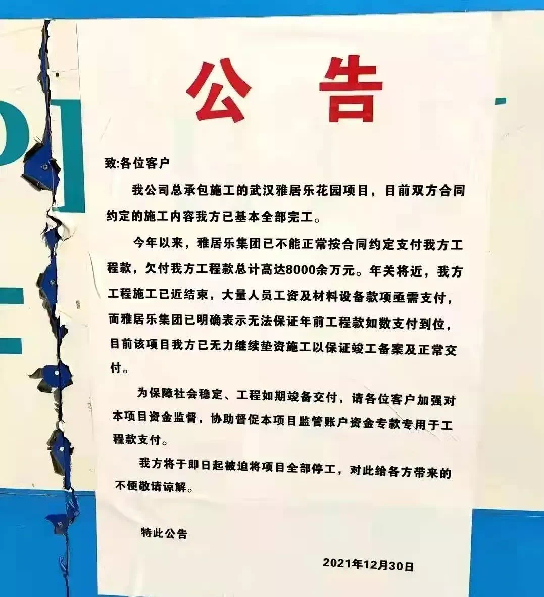 前不久,小编在朋友圈突然看一篇文章,内容大概是武汉雅居乐花园的总包公司突然贴出了一份公告: