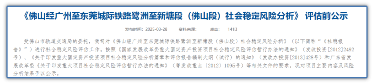 今年3月,线路进行《佛山经广州至东莞城际铁路鹭洲至新塘段(佛山段)社会稳定风险分析》 评估前公示。