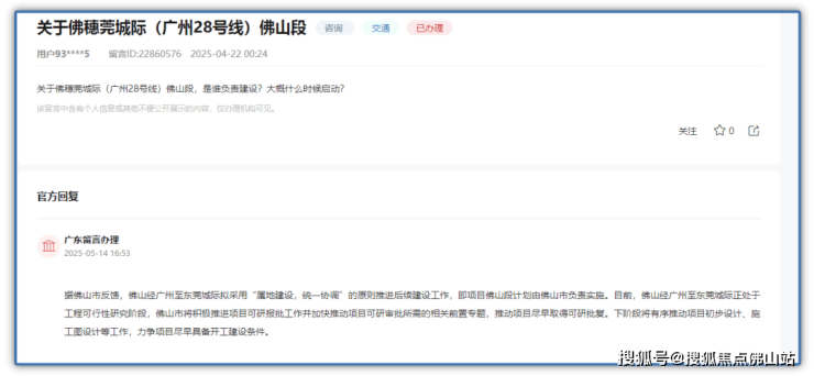 今年5月,官方回复佛穗莞线路目前正积极推动尽早取得可研批复,下阶段将推动项目初步设计、施工图设计等工作,力争项目尽早具备开工建设条件。