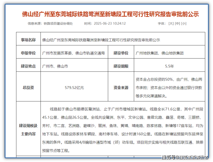 6月23日,广东省发改委公布《佛山经广州至东莞城际铁路鹭洲至新塘段工程可行性研究报告审》批前公示,这也是俗称“开工纸”的公示流程。