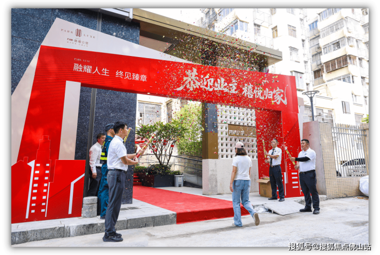 来到项目现场,高大的红色拱门上写着“恭迎业主 禧悦归家”,鲜艳的红地毯从入口一直铺向收房区。