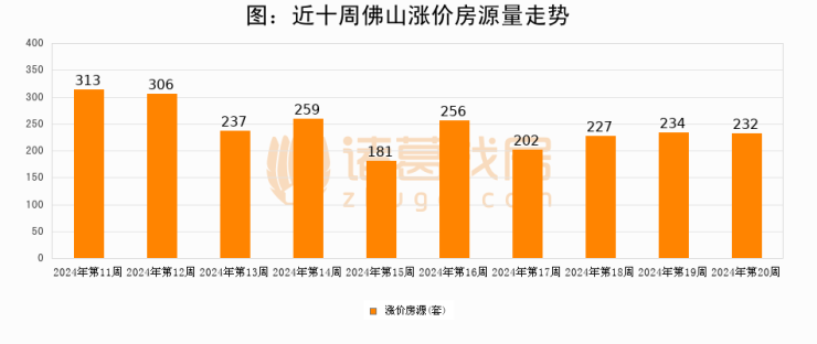 从调价房源来看,第19周佛山涨价房源232套,较上周下降0.9%。与此同时,19周涨价房源占比提升1.27个百分点,业主信心持续恢复。