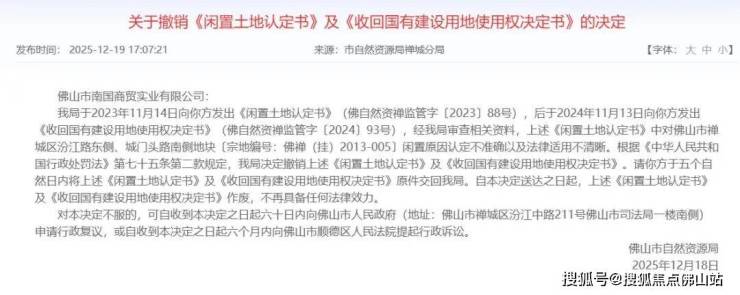 直至去年12月,佛山市自然资源局发布了关于撤销《闲置土地认定书》及《收回国有建设用地使用权决定书》的决定。