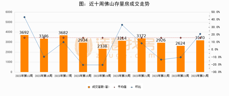 存量房方面,第24周佛山存量房成交3170套,较上周增加546套,环比上涨20.8%。从近十周成交走势来看,周均成交套数为3119套,本周高于平均水平1.6%。