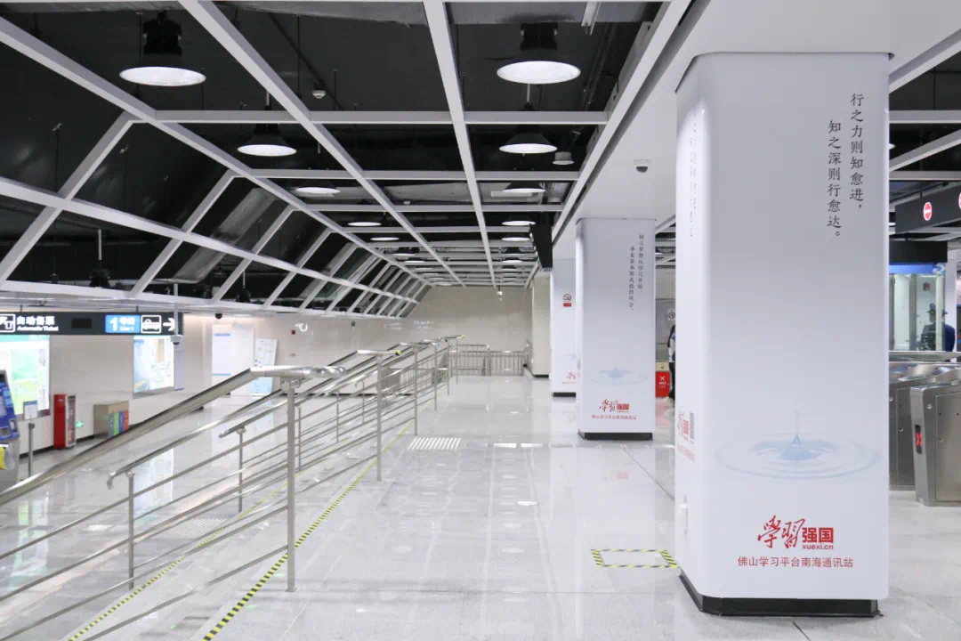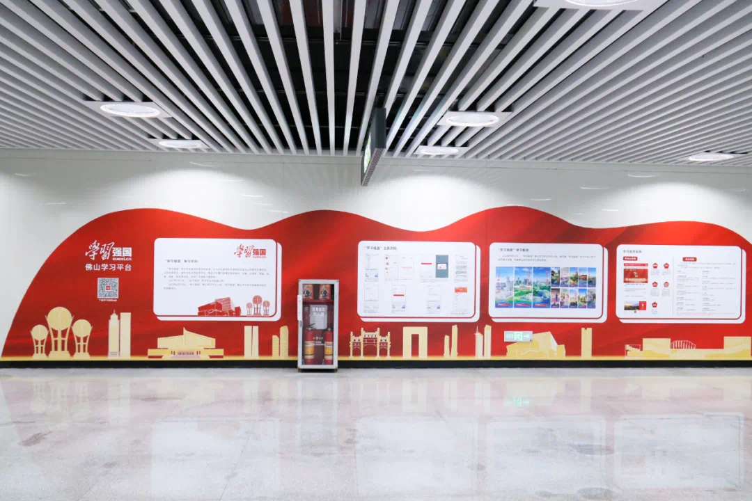 在南海有轨电车𧒽岗站内换乘时,可以看到一个长达10米的展示牌,市民朋友们可以通过展示牌,了解到更多有关“学习强国”学习平台的学习板块,以及相关注册使用流程。