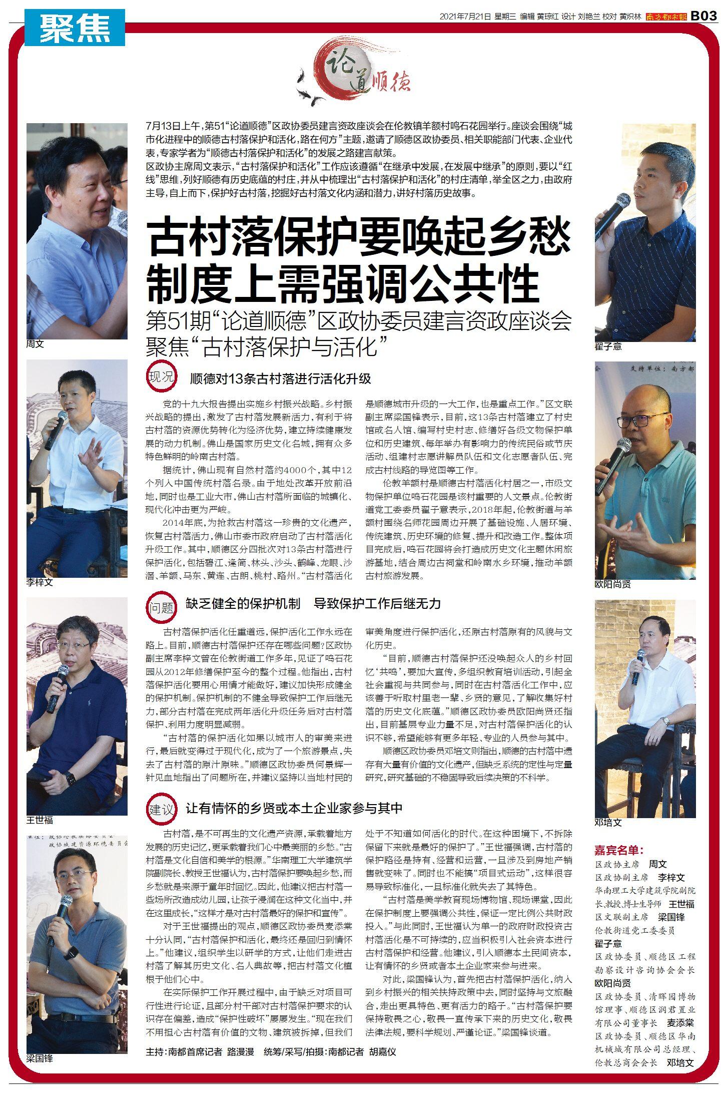 7月13日上午,第51期“论道顺德”区政协委员建言资政座谈会在伦教镇羊额村鸣石花园举行。座谈会围绕“城市化进程中的顺德古村落保护和活化,路在何方”主题,邀请了顺德区政协委员、相关职能部门代表、企业代表、专家学者为“顺德古村落保护和活化”的发展之路建言献策。