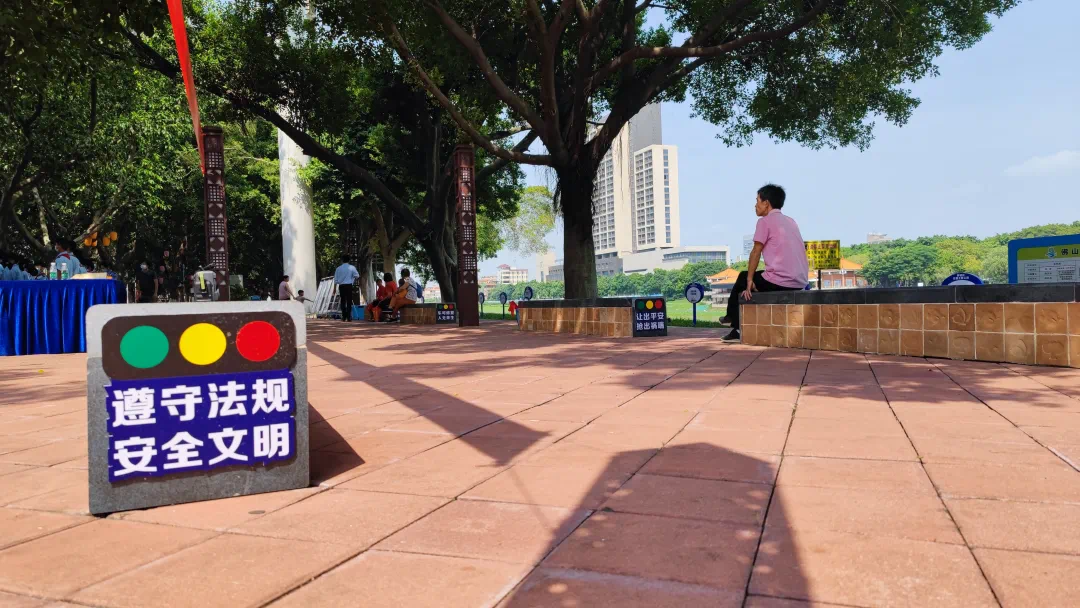 交通安全标语展示区则位于河堤边。“遵守法规 安全文明”“让出平安 抢出祸端”……河边草地上、市民歇息的石凳上都树立了多块交通安全标语。