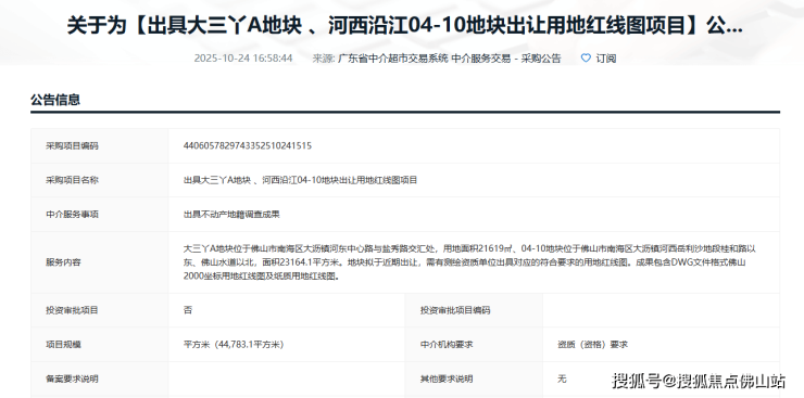 近日,广东省中介超市交易系统发布关于为【出具大三丫A地块、河西沿江04-10地块出让用地红线图项目】公开选取【测绘】机构的公告。公告显示,大三丫A地块位于佛山市南海区大沥镇河东中心路与盐秀路交汇处,用地面积2…