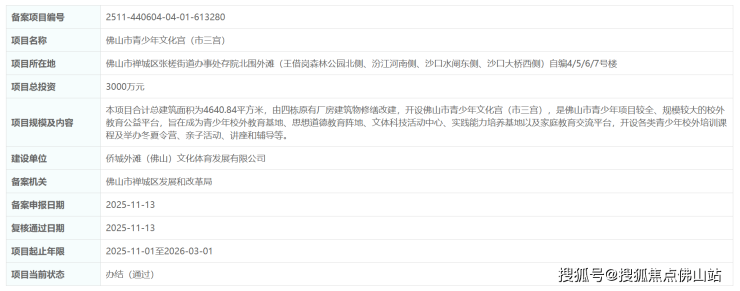 近日,佛山市青少年文化宫(市三宫)项目通过备案,总投资3000万元。