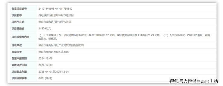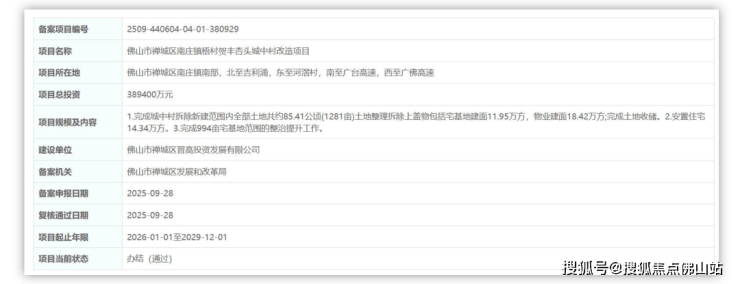备案信息中透露,该项目位于禅城区南庄镇南部,北至吉利涌,东至河滘村,南至广台高速,西至广佛高速,总投资38.94亿。