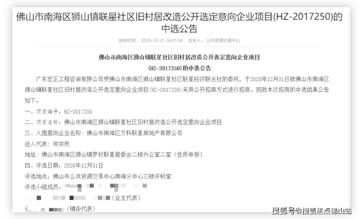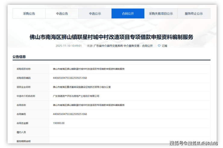 11月10日,狮山镇联星村城中村改造项目专项借款申报资料编制服务合同正式公布。