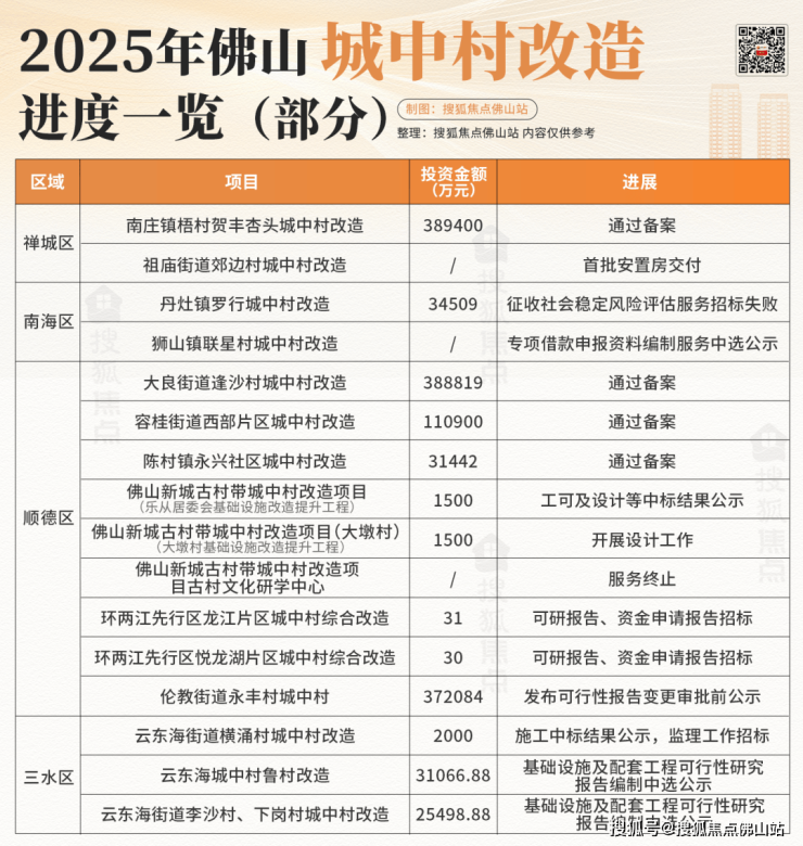 此前,佛山自然资源局发布的数据显示,2025年拟启动实施51个城中村项目,计划改造户数14083户,安置房新开工1981套,计划完成投资278.13亿元。