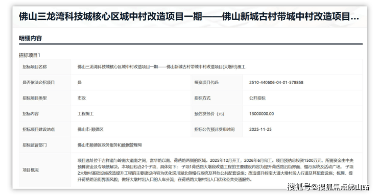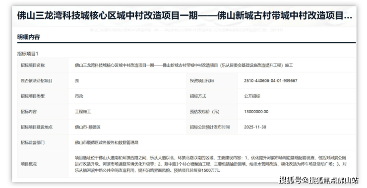佛山新城古村带城中村改造项目(乐从居委会基础设施改造提升工程)的施工招标公告,预计将于11月30日发布。