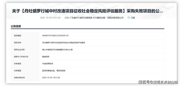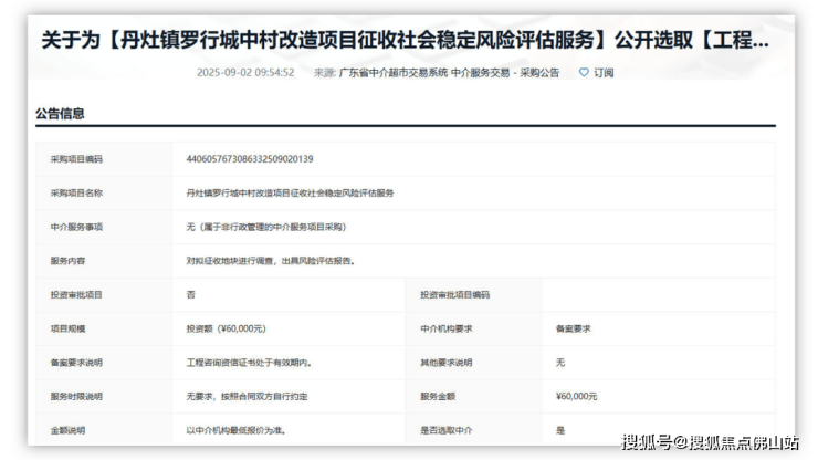 今年9月,丹灶镇罗行城中村改造项目征收社会稳定风险评估服务正式招标。