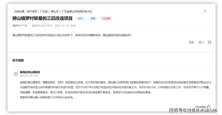 去年有网友曾咨询该项目的进度,狮山镇政府回应称:“截止至2023年12月,已完成部分旧改工作,包含但不限于入户测量、控规调整、改造意愿表决、单元计划等,未完成实施方案及拆迁补偿安置方案表决。目前双方正在按协议协商退出事宜。”