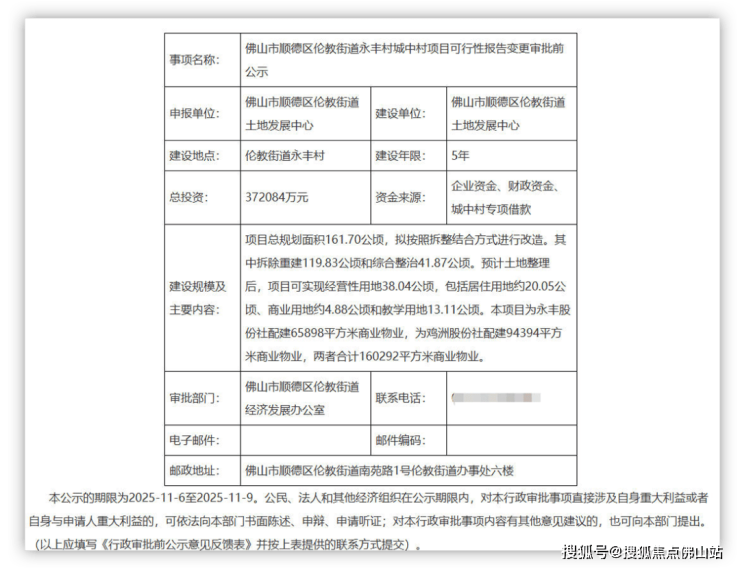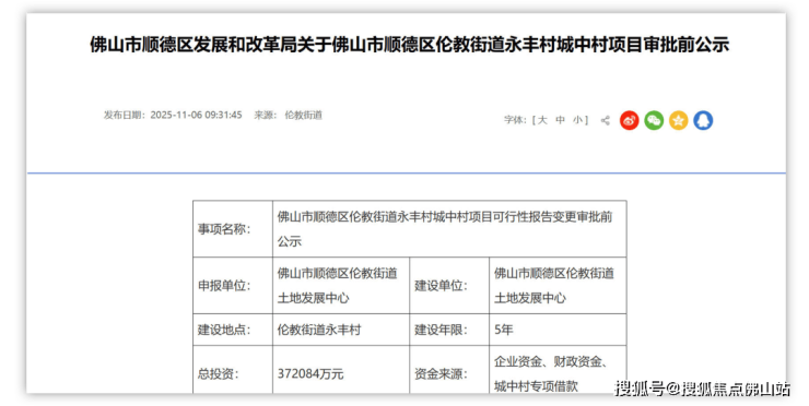 近日,顺德发改局发布关于伦教街道永丰村城中村项目审批前公示。