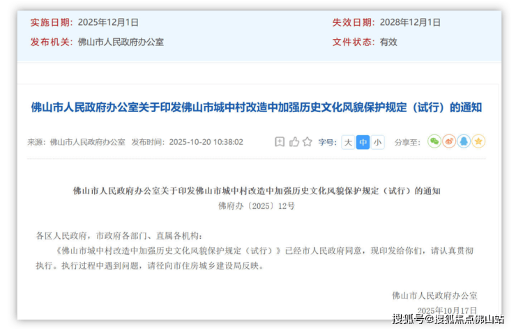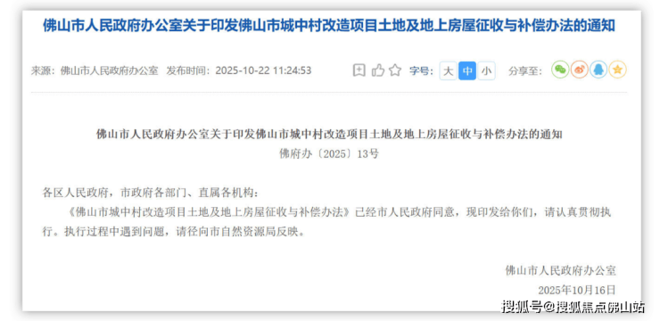 10月下旬,佛山市人民政府发布《佛山市城中村改造项目土地及地上房屋征收与补偿办法的通知》,自2025年12月1日起施行,有效期5年。