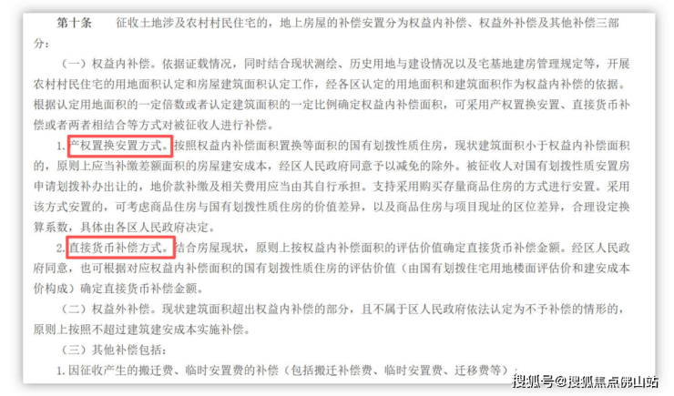 征收土地涉及农村村民住宅的,地上房屋的补偿安置分为权益内补偿、权益外补偿及其他补偿三部分。