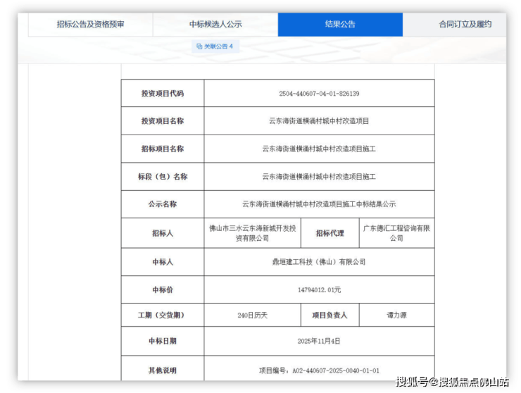 结果显示,中标人为鼎垣建工科技(佛山)有限公司,中标价约1479.4万,工期为240天,耗时约8个多月。