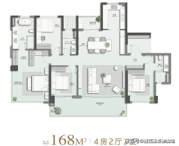 168㎡四房两厅三卫,双套房,得房率约107%,玄关入门为带套间客房,可作为老人房。